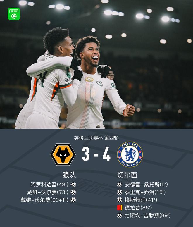英联杯切尔西4-3狼队晋级,吉滕斯1射2传,沃尔费双响难救主