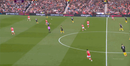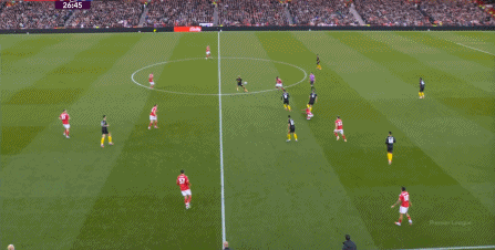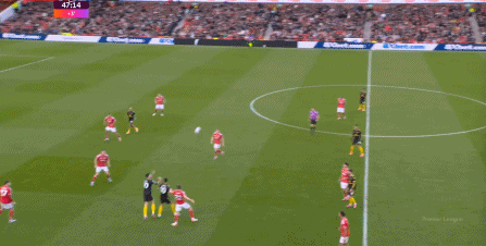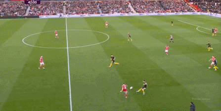 于是,最近这段时间看起来很好用的体系,在运转上出现了明显的问题,球队的进攻需要另辟蹊径,所以在30分钟前后,是布鲁诺和库尼亚这一侧,通过转移到右侧,让曼联形成了进攻: